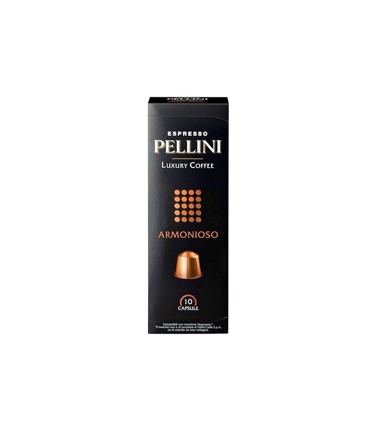 Vychutnejte si neobyčejnou italskou kávu v kapslích do kávovarů Nespresso. Za charakterem výjimečné směsi Pellini ARMONIOSO stojí vybraná zrna Arabicy z Latinské Ameriky a Asie. Sametově jemné tělo a vůně čerstvého pečiva učarují každému milovníkovi kávy. Jedno balení kávy obsahuje 10 kapslí a v každé kapsli najdete 5 g kávy.